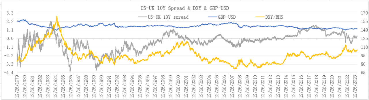 根据1979年12月26日-2024年4月12日的行情数据计算发现,美英10年利差与美元指数之间的相关系数为0.2373,呈较弱的正相关关系。当美英利差扩大,美元指数趋于上涨。计算结果还表明,美英10年利差与英镑兑美元汇率之间的相关系数为-0.4303,呈较弱的负相关关系。当美英利差扩大,英镑有贬值趋势。