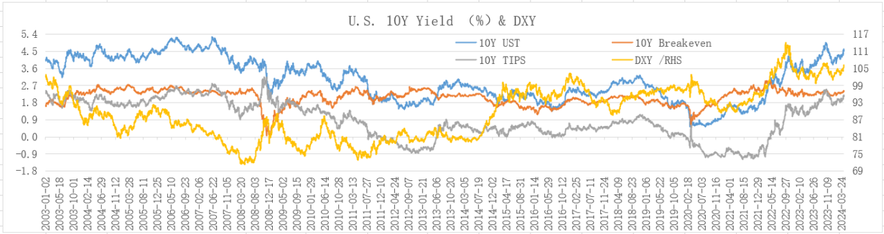 2003-2024年间,10年期美债名义收益率(10Y UST)、10年期盈亏平衡通胀率(10Y Breakeven)、10年期通胀保护债券(TIPS)收益率和美元指数(DXY)的变动趋势如下。