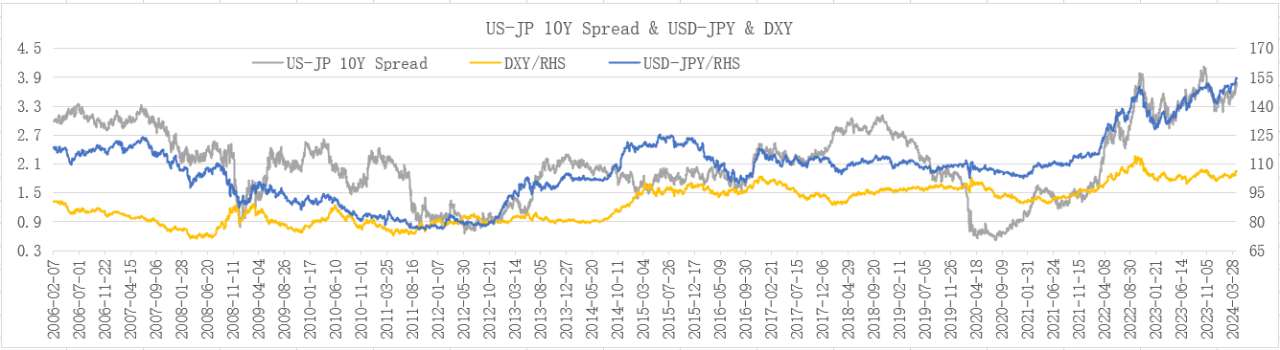 根据2006年2月27日-2024年4月18日的行情数据计算发现,美日10年利差与美元指数之间的相关系数为0.2962,呈较弱的正相关关系。当美日利差扩大,美元指数趋于上涨。
