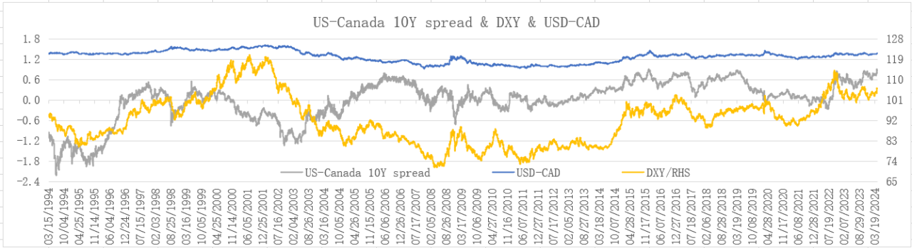 根据1994年3月15日-2024年4月18日的行情数据计算发现,美加10年利差与美元指数之间的相关系数为0.0668,呈极弱的正相关关系。当美加利差扩大,美元指数趋于上涨。