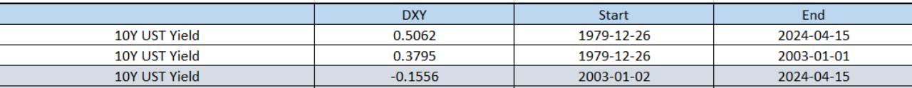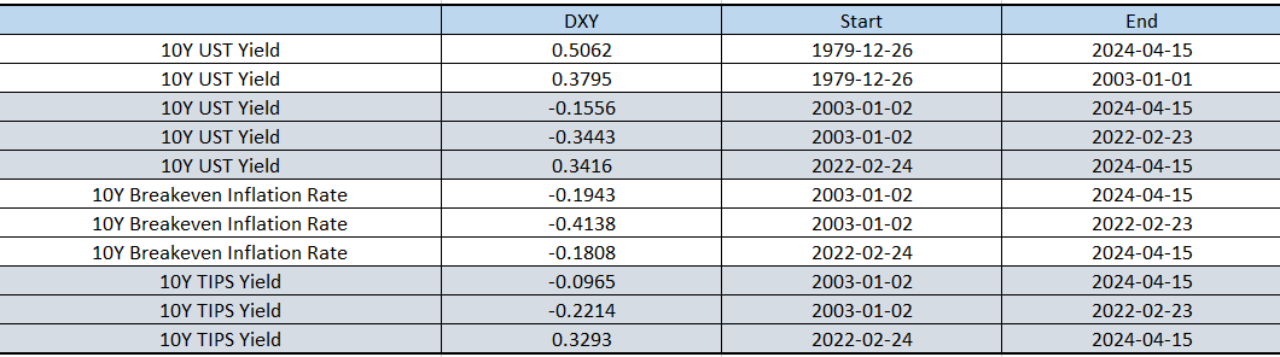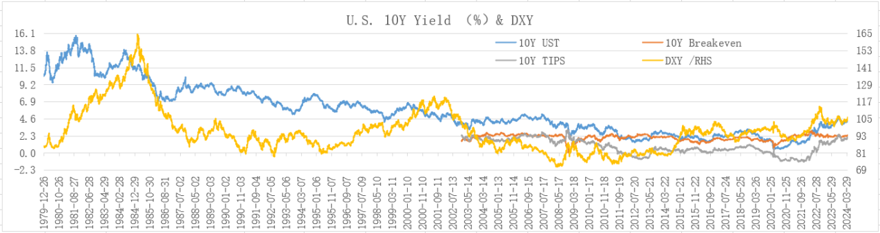 1979-2024年期间,只能考察10年期美债名义收益率(10Y UST)与美元指数(DXY)之间的关系,10年期盈亏平衡通胀率、10年期通胀保护债券(TIPS)收益率尚未问世。