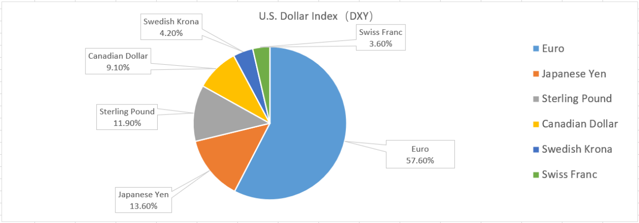 另外,影响美元指数的因素还包括美元指数篮子货币的表现。具体来说,美元指数篮子包括欧元(57.6%)、日元(13.6%)、英镑(11.9%)、加元(9.1%)、瑞典克朗(4.2%)和瑞士法郎(3.6%)。