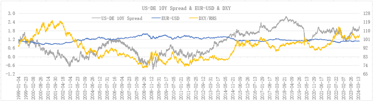 欧元区主要介绍德国。根据1999年1月4日-2024年4月12日的行情数据计算发现,美德10年利差与美元指数之间的相关系数为0.2841,呈较弱的正相关关系。当美德利差扩大,美元指数趋于上涨,这个逻辑比较容易理解。