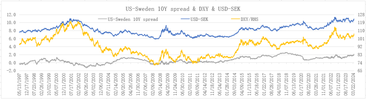 根据1997年5月13日-2024年4月18日的行情数据计算发现,美瑞(典)10年利差与美元指数之间的相关系数为0.1884,呈较弱的正相关关系。当美瑞(典)利差扩大,美元指数趋于上涨。