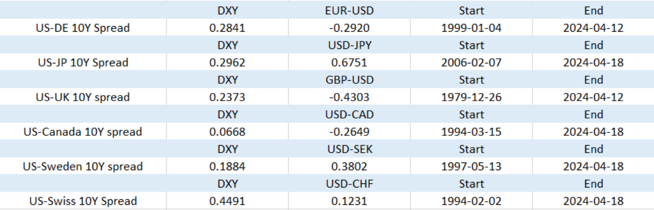 2022年2月-2024年4月期间的历史数据表明,10年期美债名义收益率(10Y UST)、10年期盈亏平衡通胀率(10Y Breakeven)、10年期通胀保护债券(TIPS)收益率和美元指数(DXY)之间的相关系数分别为0.3416、-0.1808和0.3293。其中,10年期盈亏平衡通胀率(10Y Breakeven)与DXY之间继续呈现较弱的负相关关系,但10年期美债名义收益率(10Y UST)、10年期通胀保护债券(TIPS)收益率与DXY之间均呈较弱的正相关关系,相关性发生了逆转。