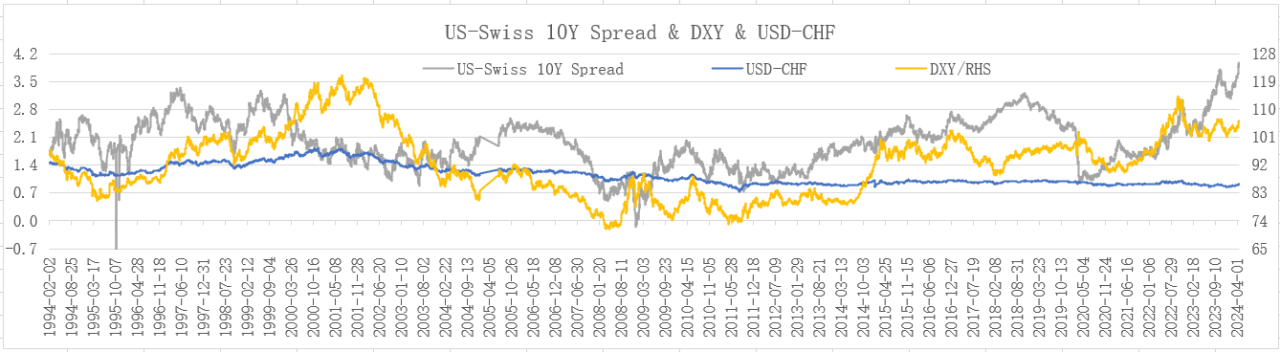 根据1994年2月2日-2024年4月18日的行情数据计算发现,美瑞(士)10年利差与美元指数之间的相关系数为0.4491,呈较弱的正相关关系。当美瑞(士)利差扩大,美元指数趋于上涨。