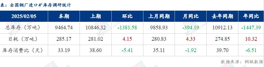 Mysteel统计全国钢厂进口铁矿石库存总量为9464.74万吨,环比减1381.58万吨;当前样本钢厂的进口矿日耗为285.17万吨,环比增4.15;库存消费比33.19天,环比减5.41。