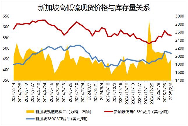 截至2月5日当周,新加坡燃料油库存环比增加,馏分油库存同步攀高