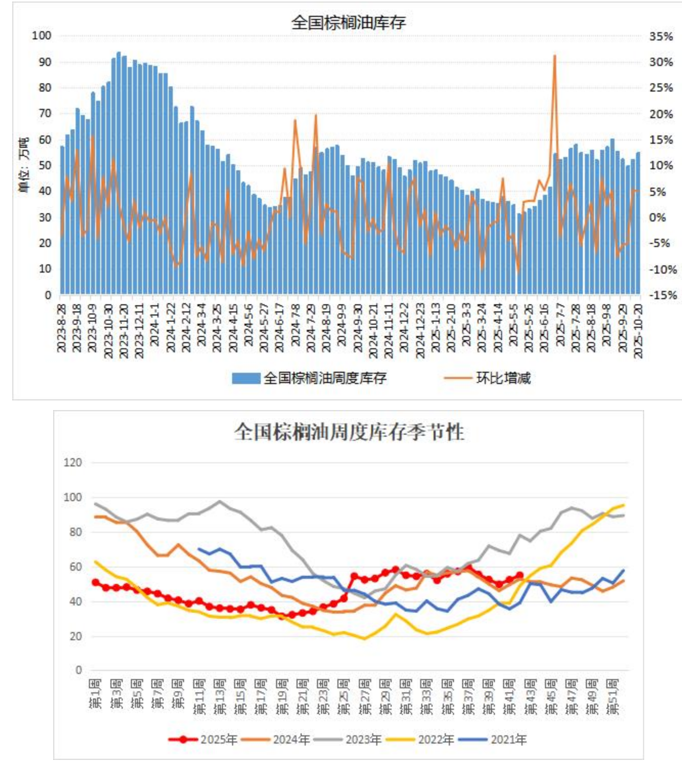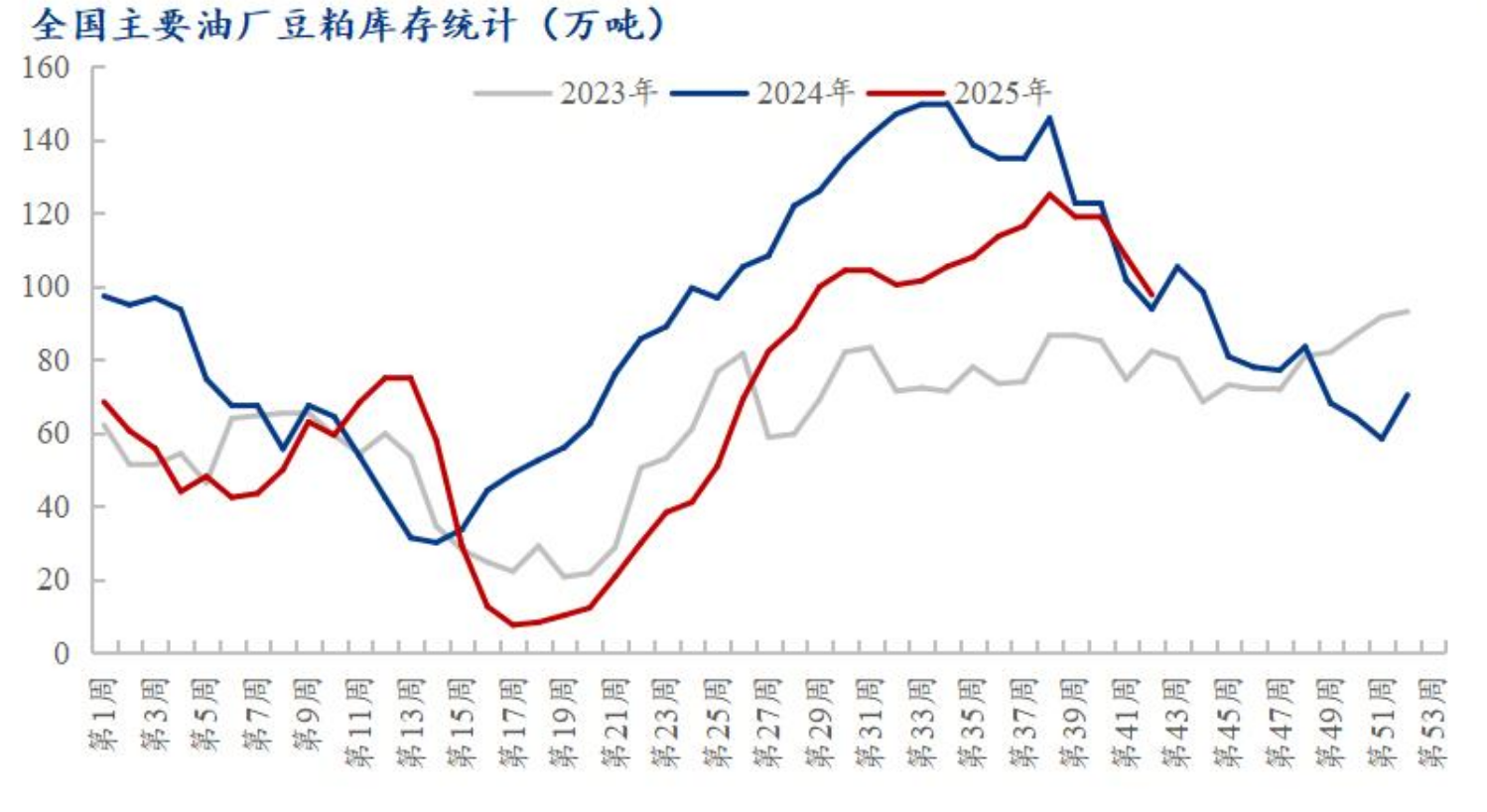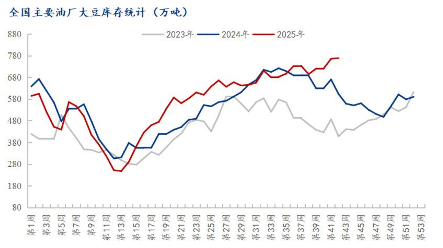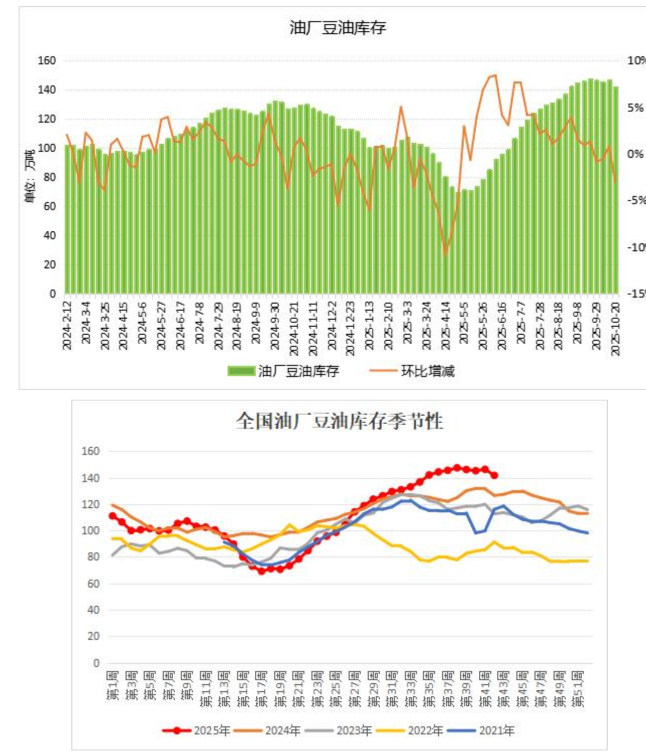 上周油厂开机率自节前的47%大幅回升至65%附近,豆油产出随之增加,但由于贸易商集中提货,油厂豆油库存再度下降。机构监测数据显示,截止到2025年第42周末,国内豆油库存量为141.7万吨,较上周的146.3万吨减少4.6万吨,环比下降3.12%。其中:沿海库存量为128.0万吨,较上周的132.4万吨减少4.4万吨,环比下降3.33%。
