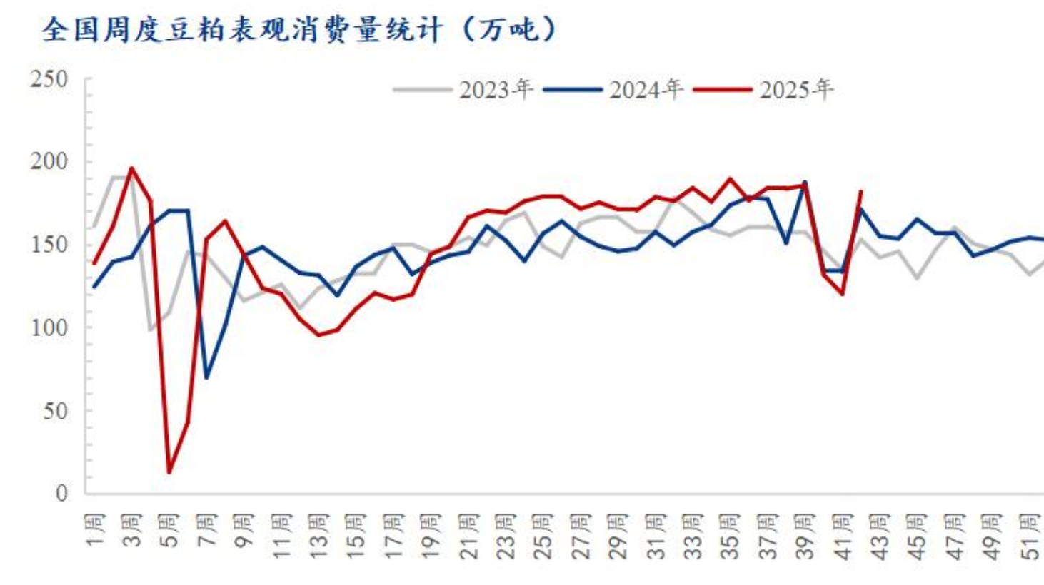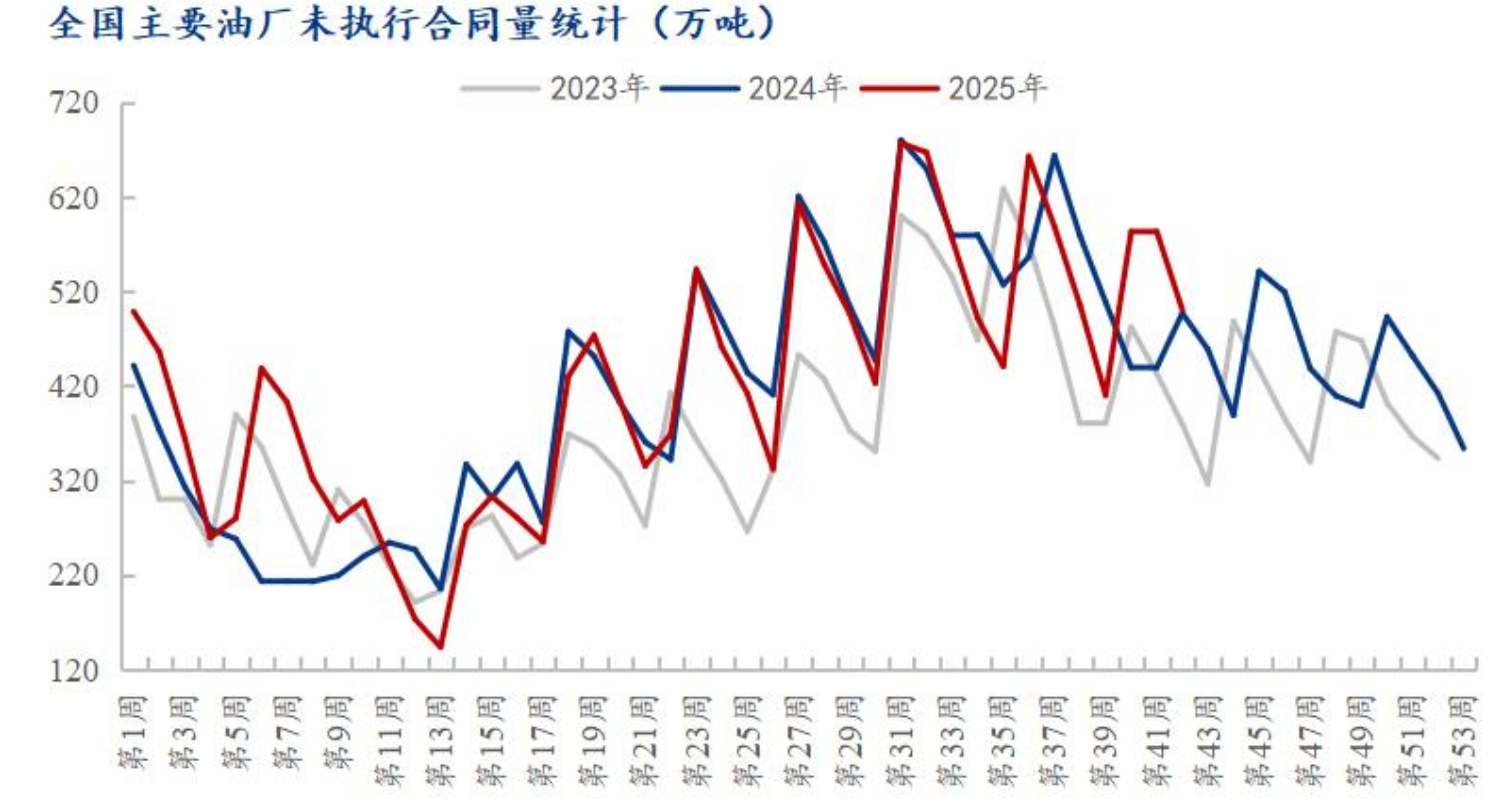 据Mysteel对国内主要油厂调查数据,2025年第42周,全国主要油厂大豆库存上升,豆粕库存下降,未执行合同下降。其中,大豆库存768.7万吨,较上周增加2.94万吨,增幅0.38%,同比去年增加165.75万吨,增幅27.49%;豆粕库存97.62万吨,较上周减少10.29万吨,减幅9.54%,同比去年增加3.90万吨,增幅4.16%;未执行合同500.70万吨,较上周减少82.60万吨,减幅14.16%,同比去年增加3.7万吨,增幅0.07%;豆粕表观消费量为181.42万吨,较上周增加61.42万吨,增幅51.18%,同比去年增加10.79万吨,增幅6.32%。
