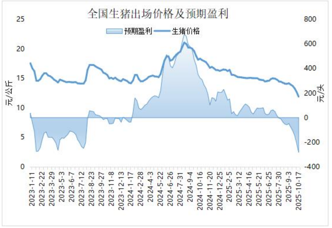 当前阶段猪源供应充足,而需求端承接力度不足,供需矛盾仍然相对突出,生猪均价环比继续下滑,养殖预期亏损幅度扩大至三年半高位。国家发改委价格监测中心披露的数据显示,2025年10月第3周,全国生猪出场价格为11.9元/公斤,较上一期下降6.08%,再度刷新近年来低位。全国猪料比价为4.56,环比下跌5.00%。按目前价格及成本推算,未来仔猪育肥模式的生猪养殖头均亏损为281.88元。