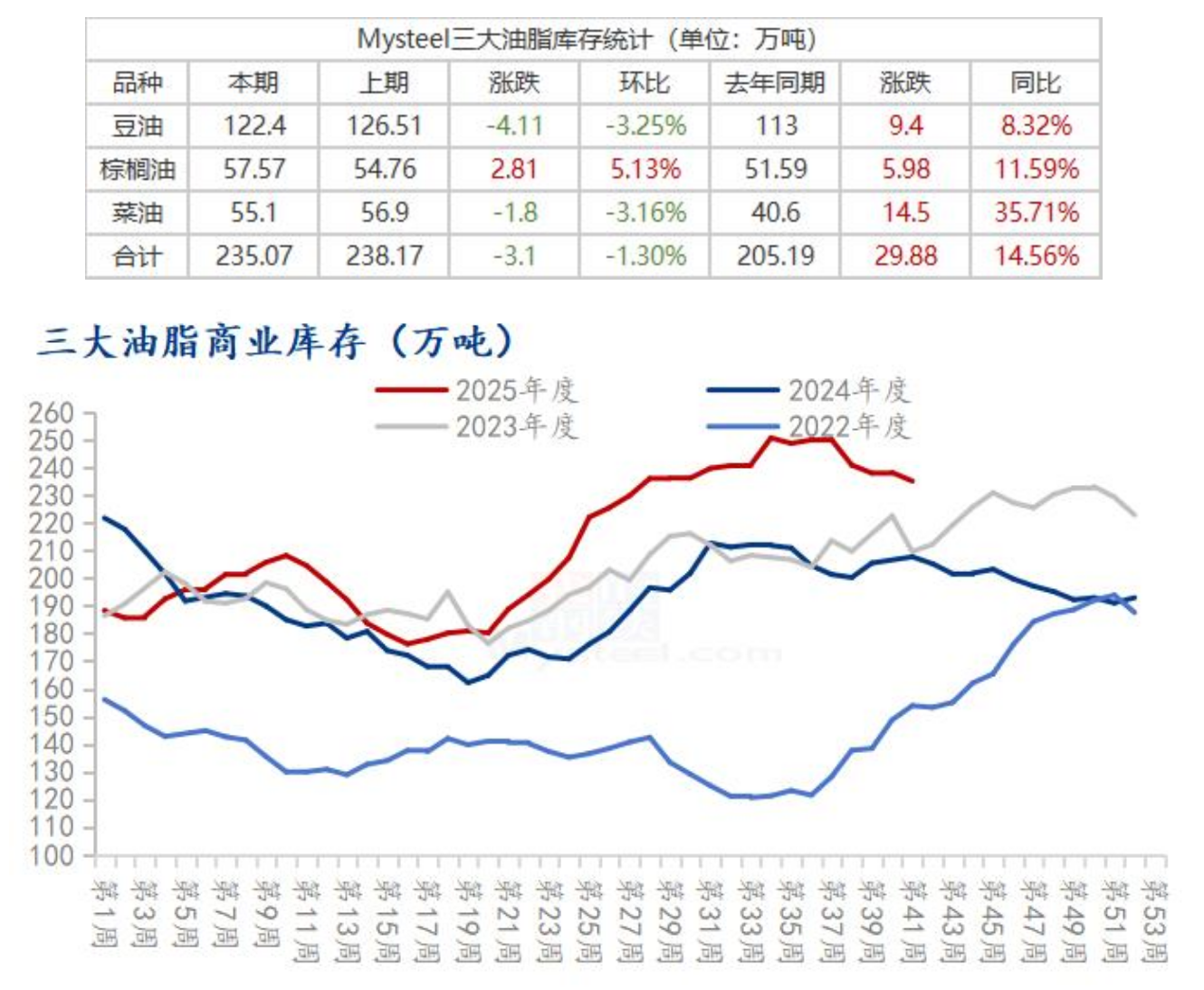 据Mysteel调研,截至2025年10月17日,全国重点地区豆油、棕榈油、菜油三大油脂商业库存总量为235.07万吨,较上周减少3.10万吨,跌幅1.30%;同比去年同期上涨29.88万吨,涨幅14.56%。