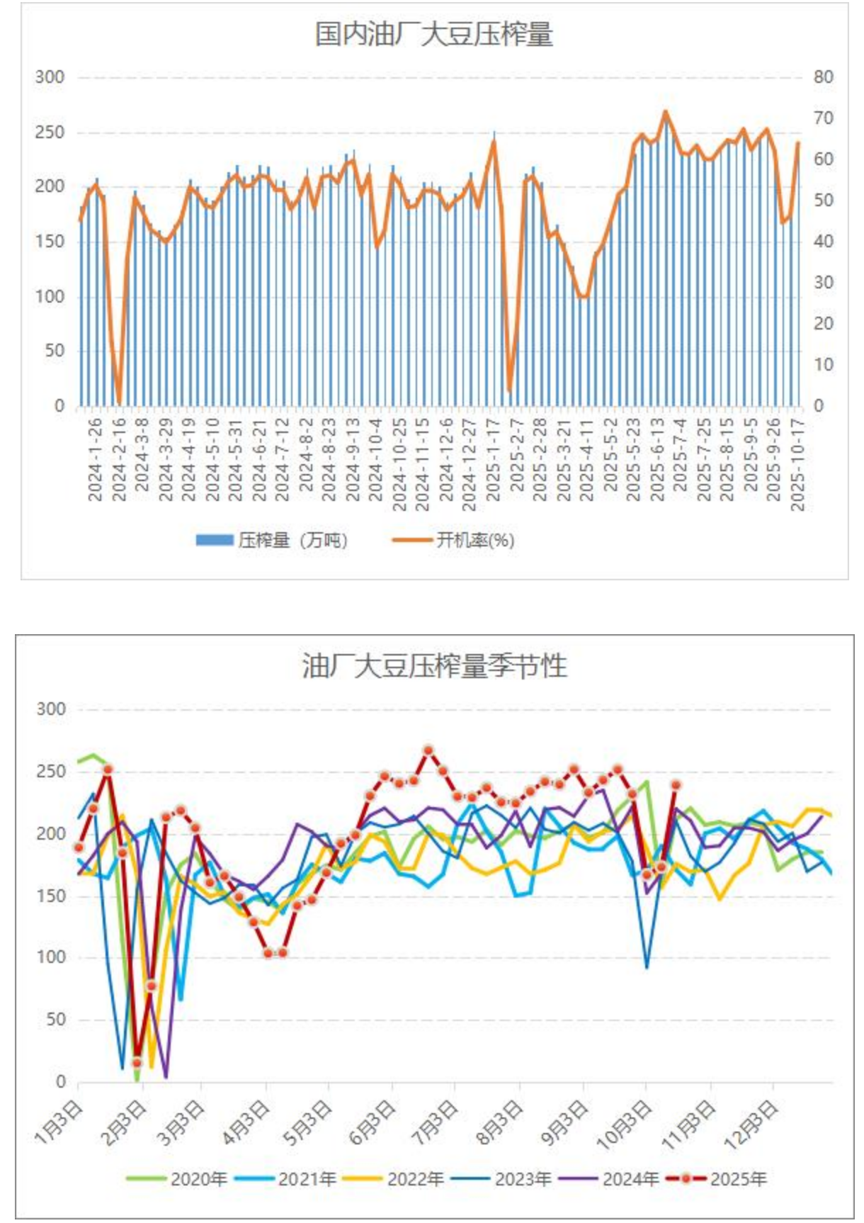 长假过后,上周国内油厂开机快速恢复,大豆压榨量回升至200万吨以上高位。机构监测数据显示,截止到第42周末(10月18日),国内主要大豆油厂的大豆开机率较上周有所增长,整体上处于很高水平。国内油厂平均开机率为63.89%,较上周的46.56%开机率增长17.33%。全国油厂大豆压榨总量为238.90万吨,较上周的173.06万吨增加了65.84万吨,其中国产大豆压榨量为7.22万吨,进口大豆压榨量为231.68万吨。本周预期大豆加工量继续攀升至253.84万吨高位,开机率为67.66%。