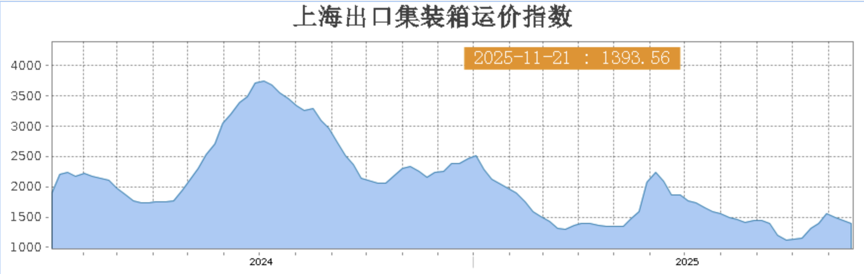 据上海航运交易所,11月21日,上海出口集装箱运价指数(综合指数)报1393.56点,环比下跌57.82点或3.98%;中国出口集装箱运价综合指数报1122.79点,环比上涨2.6%。