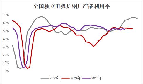 据Mysteel,部分钢厂前期产线检修完成,逐步恢复正常生产,本周全国独立电弧炉钢厂开工率环比上升1个百分点至69.13%,创近两个月高位,而终端需求进一步回落,部分钢厂销售压力较大,生产积极性有所下降,主动选择减少生产时间以压减产量,独立电弧炉钢厂平均产能利用率51.56%,环比下降1.62个百分点。
