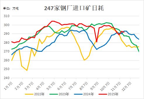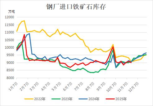 据Mysteel,盈利钢企占比继续走高,本周钢厂日均铁水产量再度下降,样本钢厂进口矿日耗环比下降0.95万吨至291.68万吨,钢厂按需采购,厂内库存环比微降74.78万吨至9001.23万吨,处于近几年同期偏低水平,库存消费比下降0.16天至30.86天。