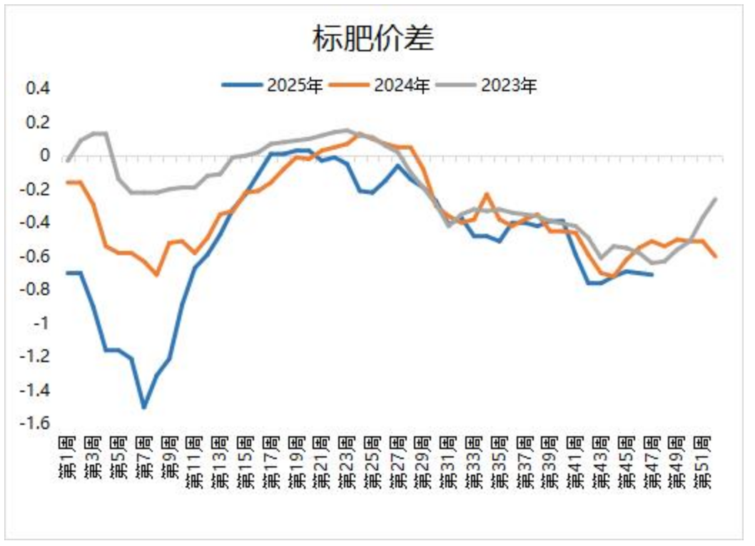 目前市场总体处于供应过剩、腌腊未旺阶段,标猪走货略显迟缓,供应压力相对更大。部分养殖户因看好后市腌腊需求,对肥猪存在惜售情绪,减缓了肥猪价格的下跌速度。若天气继续降温,南方腌腊需求陆续启动,肥猪相对抗跌的格局可延续,价差或继续走扩。据Mysteel发布的数据显示,11月20日当周,全国标肥价差在-0.71元/公斤,较上周继续走扩0.01元/公斤。