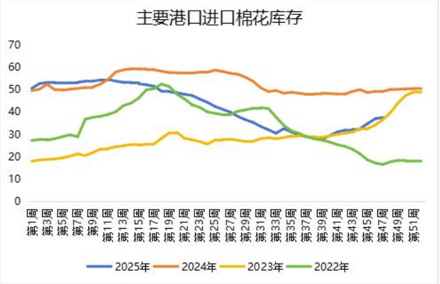 据Mysteel,本年度配额剩余较少,人民币出货量有限,港口基本维持进多出少局面。据Mysteel调研显截止至11月20日,进口棉主要港口库存37.55万吨,周环比增加1.46%,升至逾4个月最高水平。其中,山东地区青岛、济南港口及周边仓31.2万吨,同比减少22.19%,江苏地区张家港港口及周边仓库进口棉库存约3.44万吨,其他港口库存约2.91万吨。