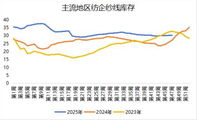据Mystee,新疆地区消费淡季不淡,走货较为顺畅,大型厂成品纱库存约35天左右;内地纺企少量累库但暂时无库存压力,库存维持在11-15天。据Mysteel农产品数据监测,截至11月20日,主要地区纺企纱线库存为30.2天,持平于之前一周,高于去年同期水平。