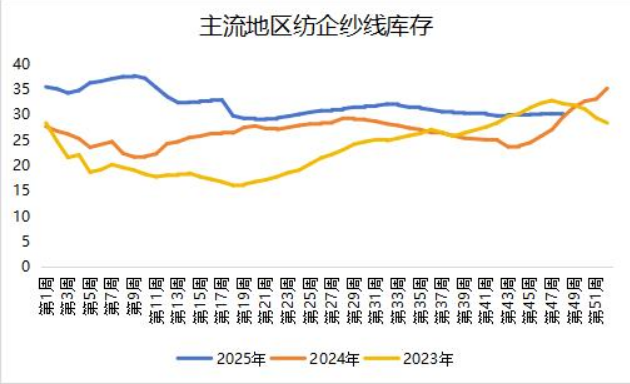 据Mystee,近日贸易商采购增加,40s以上高支纱走货加快,纺企整体库存下降明显,新疆大型厂成品纱库存约35天左右,内地企业库存维持在11-15天。据Mysteel农产品数据监测,截至11月27日,主要地区纺企纱线库存为30天,周度下降0.66%,刷新4周低点。
