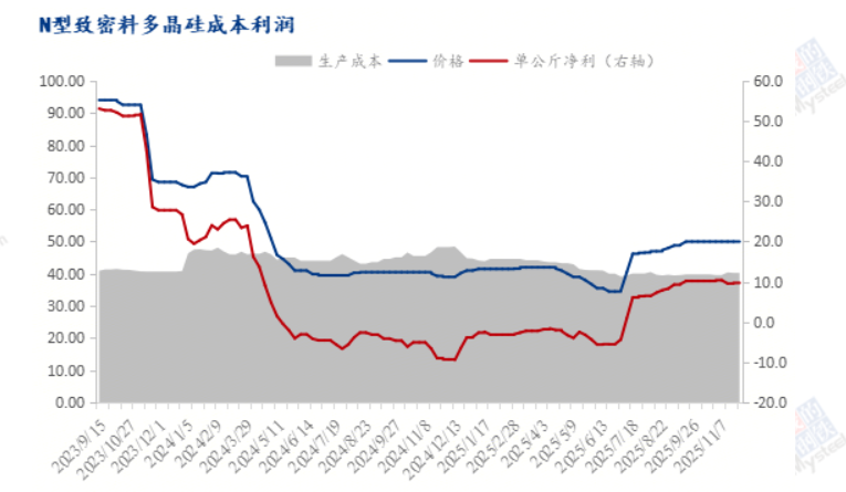 据Mysteel,截至11月28日,本周多晶硅(N型致密料)市场均价50元/千克,即期制造成本约40.27元/千克,即期单公斤净利约为9.73元/千克。价格方面,本周多晶硅N型致密料均价环比持平。成本方面,成本环比持平。本周多晶硅环节净利润环比持平。