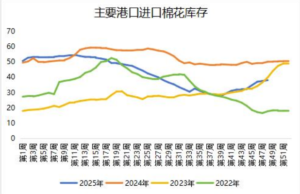 据Mysteel,近期人民币出货量有限,澳棉和巴西棉到港入库量提速,港口基本进多出少,市场交易清淡。据Mysteel调研显示,截止至11月27日,进口棉主要港口库存38.03万吨,周环比增加1.28%,升至4个半月高点。其中,山东地区青岛、济南港口及周边仓31.7万吨,同比减少22.87%,江苏地区张家港港口及周边仓库进口棉库存约3.42万吨,其他港口库存约2.91万吨。