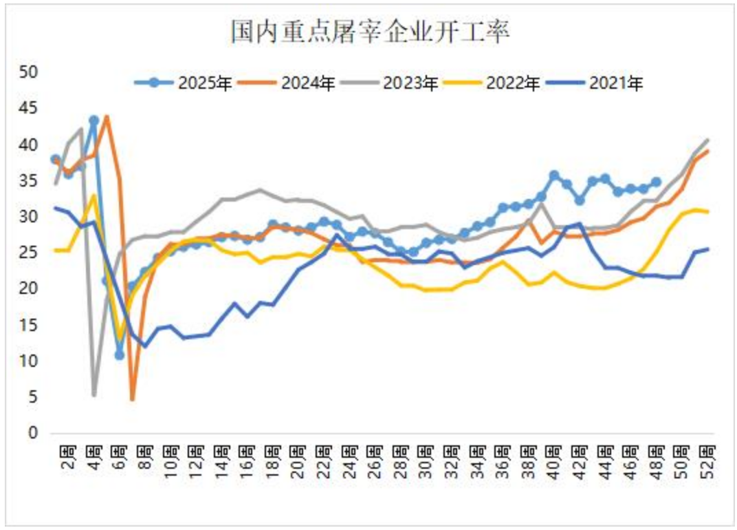 北方地区气温下降,且白条价格年内偏低位运行,终端走货略有好转,屠企宰量小幅增加,周内企业开工率于34.06-36.00%区间波动。据Mysteel发布的数据显示,11月27日当周,屠宰企业开工率为34.84%,较上周增加0.97个百分点,同比增加3.41个百分点。