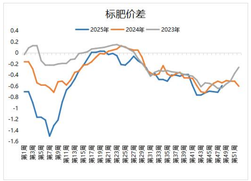 近期大体重猪源出栏积极性逐步提升,市场大猪供应集中增加,给肥猪价格带来较大压力。气温下降后,南方腌腊需求尚未大规模启动,对肥猪的实际消费拉动有限。同时终端承接能力有限,屠宰压价收购意愿较强,使供应充裕的肥猪价格承压更甚。肥猪价格跌幅远大于标猪价格跌幅,反映出当前市场上肥猪的表现显著弱于标猪。据Mysteel发布的数据显示,11月27日当周,全国标肥价差在-0.59元/公斤,较上周走缩0.12元/公斤。
