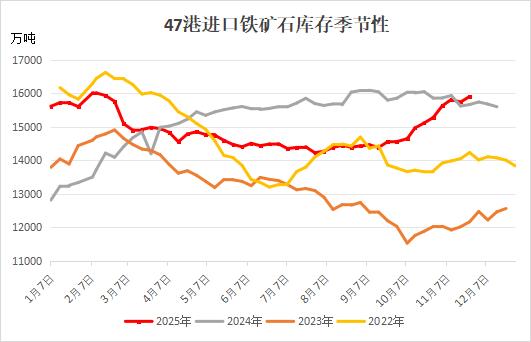 国内47港铁矿石库存创一年新高,处于近几年同期最高水平