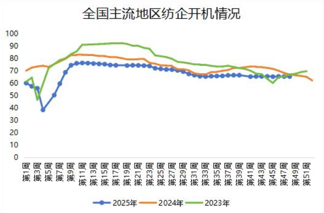 据Mysteel,纺企新增订单尚可,新疆纺企订单可加工至12月底,开机率维持高位,达到9成以上。内地订单则略显清淡,开机暂时较为平稳,维持在6成左右。据Mysteel农产品数据监测,截至11月27日主流地区纺企开机负荷在65.5%,较上周持平,低于去年同期水平。
