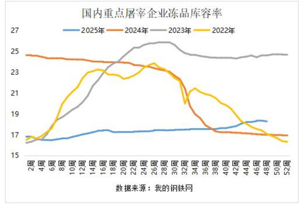财联社鹰眼讯,春节前屠宰厂处于积极消化库存阶段,尽管仍存在被动入库,但屠宰厂产品消化增加,消化量大于入库量,推动库存小幅走低。据Mysteel发布的数据显示,11月27日当周,国内重点屠宰企业冻品库容率为18.30%,较上周下滑0.07%。