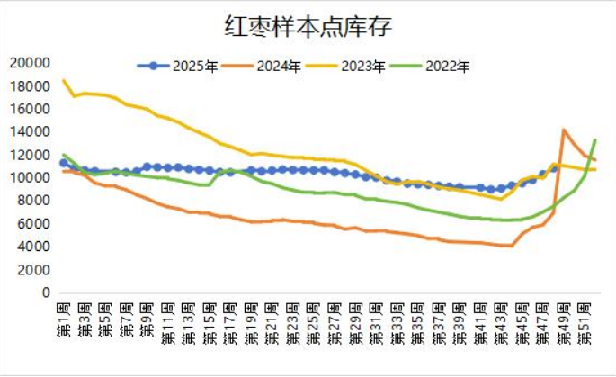 据Mysteel,红枣样本点库存大幅攀升,全疆整体收购进度接近五成附近,三师及麦盖提地区的收购节奏相对滞后,收购完成的货源正有序装箱并陆续发运。企业收购少量中小客商为采购主体,沧州客商是目前市场的主要采购力量,后续需继续密切关注各产区剩余货源的收购推进情况。据Mysteel农产品调研数据统计,11月27日当周,36家样本点物理库存在10848吨,较上周增加518吨,环比增加5.01%,刷新8个月高点,亦高于去年同期,同比增加90.32%。