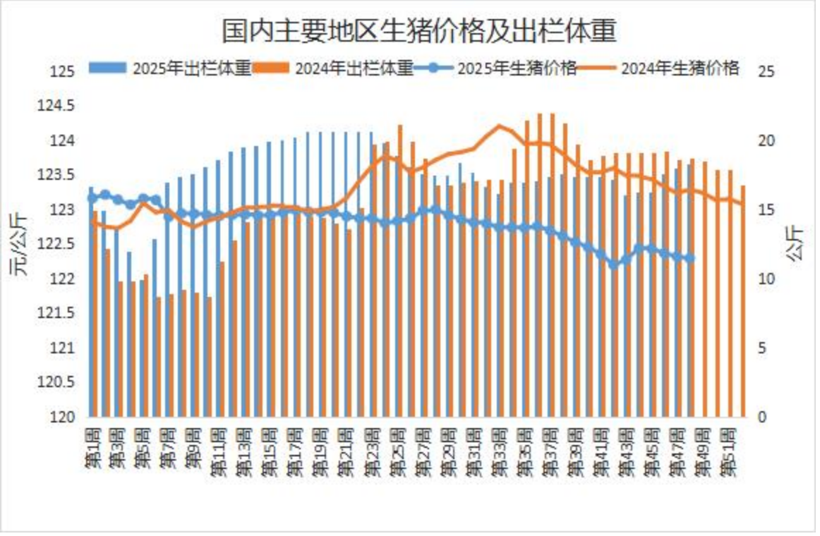 由于北方标肥价差收窄,且部分区域出现点状疫病,二育及散养户持续压栏意向松动,大猪出栏占比仍高。规模场多控重出猪,但前期部分企业出栏节奏偏慢导致毛猪被动压栏,带动周内生猪出栏均重微幅回升。据Mysteel发布的数据显示,11月27日当周,全国外三元生猪出栏均重为123.66公斤,较上周涨0.06公斤,环比涨幅0.05%,同比降幅0.06%。