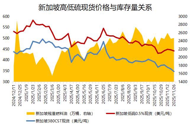 截至11月26日当周,新加坡燃料油库存小幅增加,馏分油库存持续探底