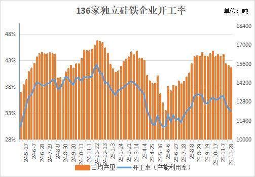 据Mysteel,硅铁主产区面临一定成本压力,但投产节奏调整幅度不大,产量小幅下调。本周Mysteel统计全国136家独立硅铁企业开工率为33.41%,较上周减少0.40%;日均产量为15320吨,环比上周下降0.97%,减少150吨,创近16周来新低。