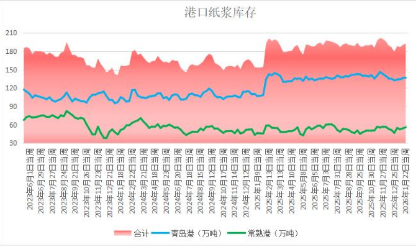 据隆众资讯,截至2026年1月22日,中国纸浆主流港口样本库存量为206.8万吨,较上期累库5.4万吨,环比上涨2.7%,库存量在本周期继续呈累库的走势,港口样本库存连续三周呈现累库的走势。本周期纸浆国内主流港口岛港库存维持小幅累库的趋势,港内日均出货速度较上周期有所减缓。本周期常熟港库存呈现窄幅累库的趋势,港内出货量变动不大,维持11万吨上下。本周期其余港口库存数量均有不同程度的累库趋势。
