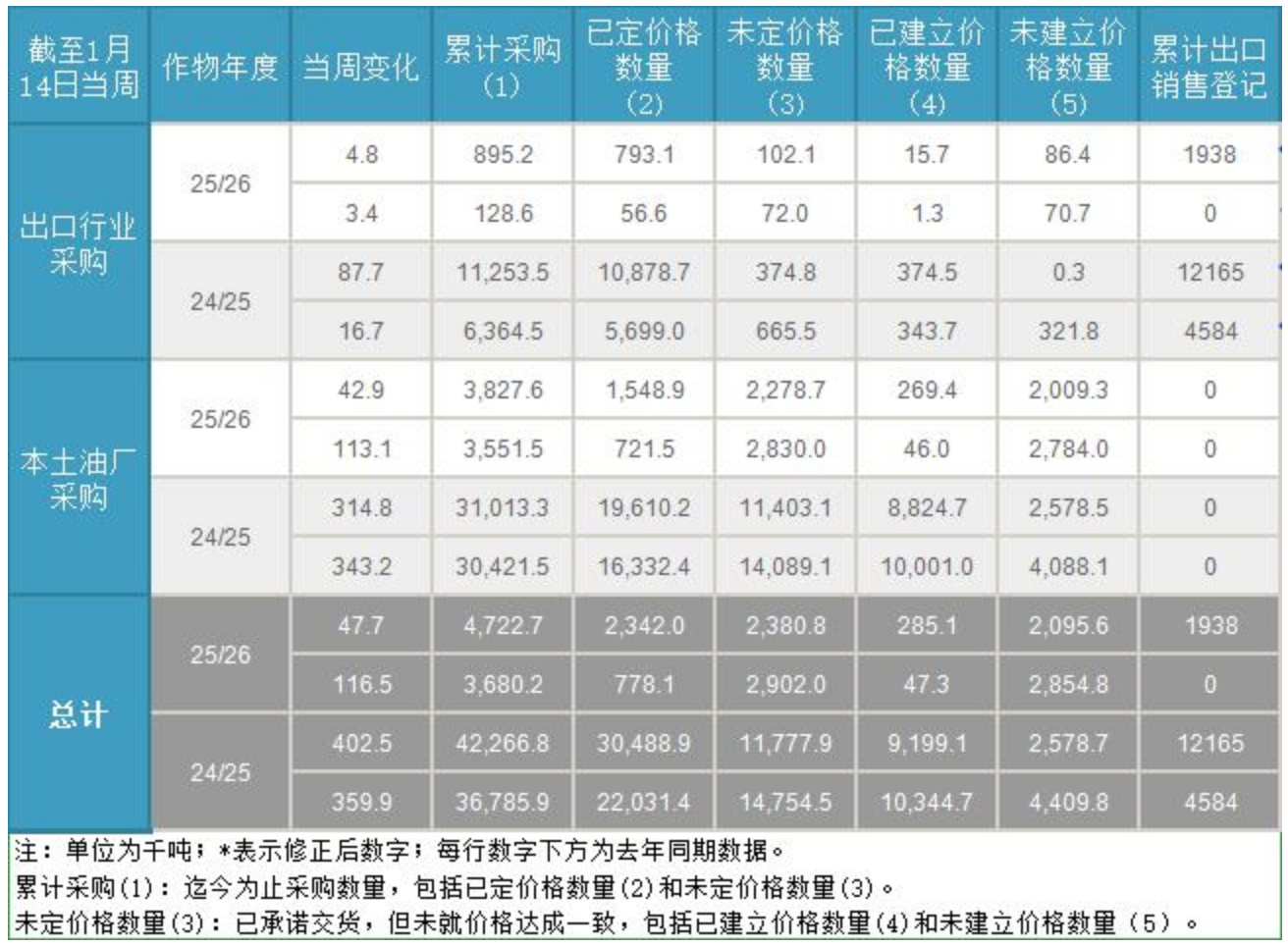 截至1月14日,25/26年度大豆累计出口销售登记数量为193.8万吨,24/25年度大豆累计出口销售登记数量为1216.5万吨。