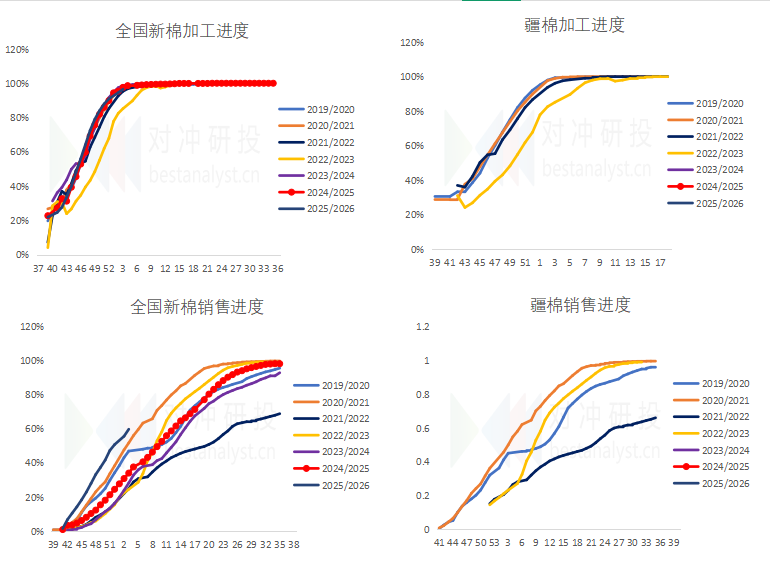 据国家棉花市场监测系统对11省区43县市900户农户调查数据显示,截至2026年1月15日,全国新棉采摘已基本结束;全国交售率为99.7%,同比持平,较过去四年均值提高0.5个百分点。