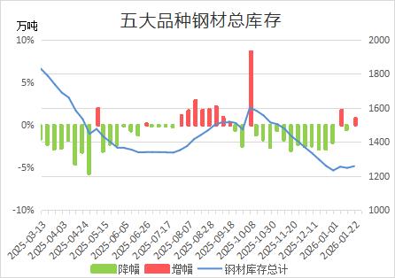据Mysteel,截至1月22日当周,螺纹钢产量、厂库均由降转增,社库连续第三周增加,表需由增转降。