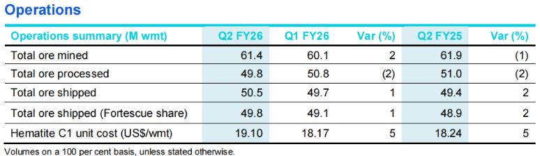据Mysteel,北京时间2026年1月22日,澳大利亚矿业公司福德士河(Fortescue)发布2025年第四季度(2026澳大利亚财年Q2)运营报告,报告显示: