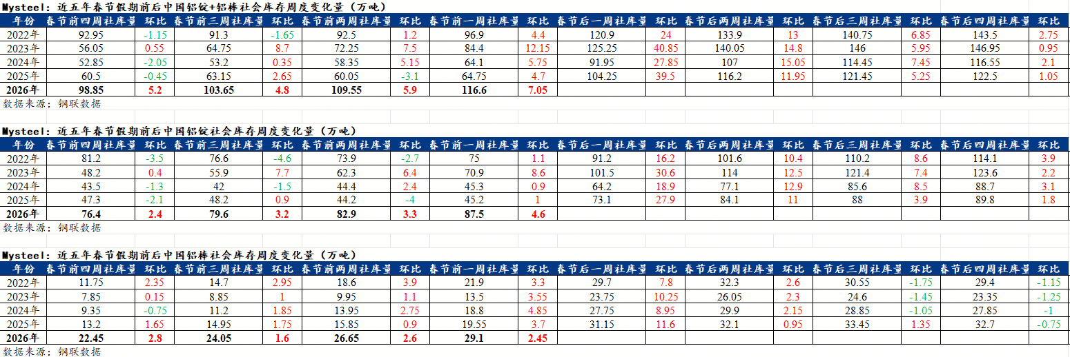 据Mysteel,近五年春节假期前后铝锭&铝棒社会库存周度变化汇总,如图: