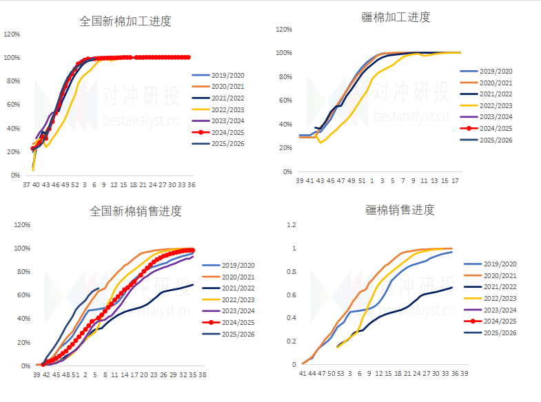 据国家棉花市场监测系统对11省区43县市900户农户调查数据显示,截至2026年2月5日,全国新棉采摘已基本结束;全国交售率为99.9%,同比持平,较过去四年均值提高0.4个百分点。