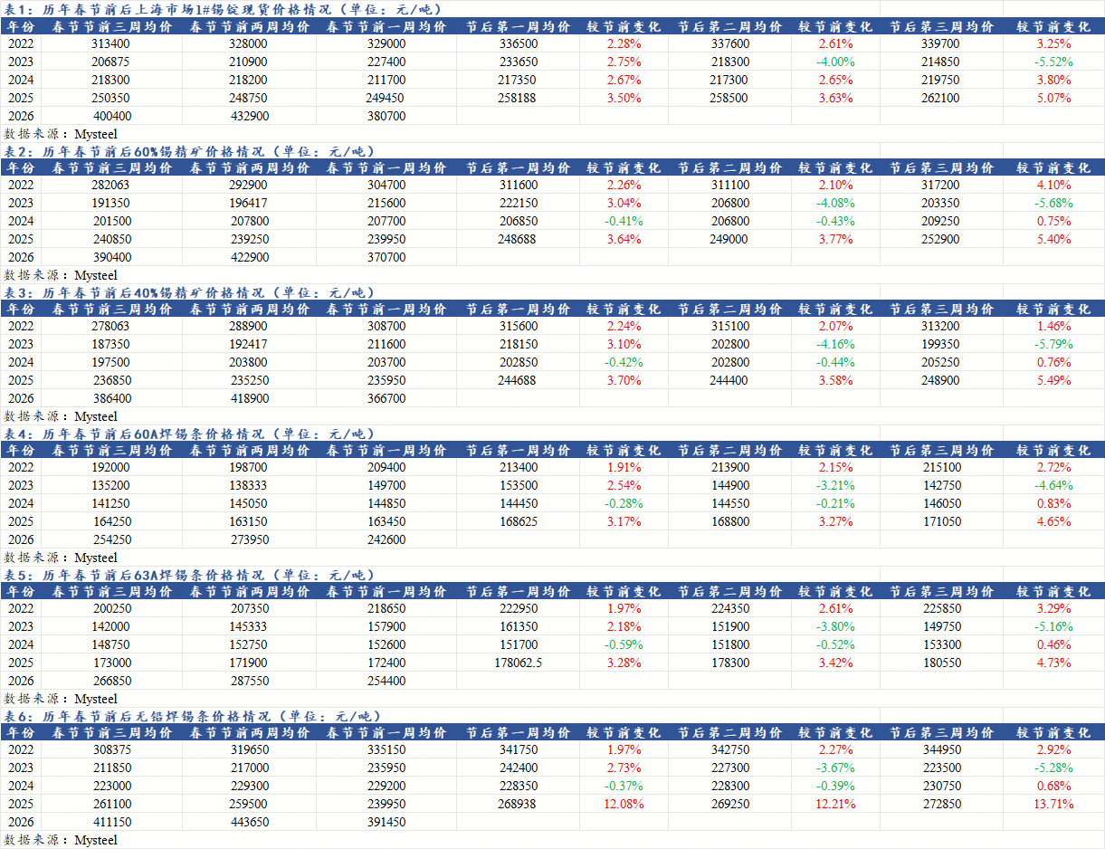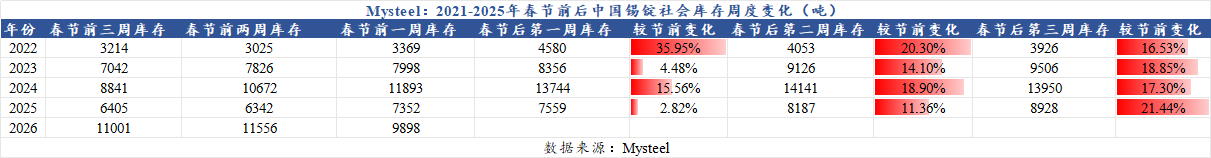 据Mysteel,2022-2026年春节前后中国锡锭库存周度变化汇总,如下图: