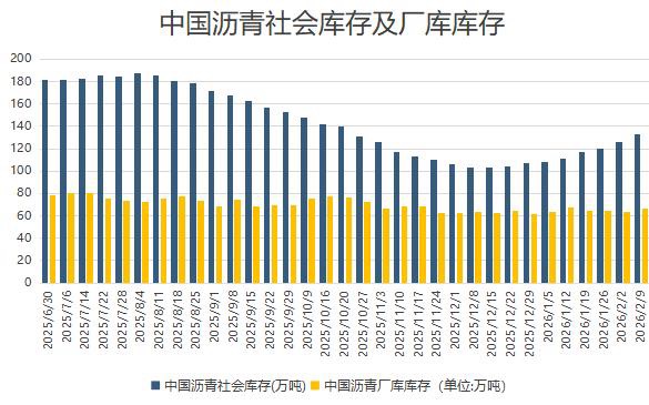 截至2月9日当周,沥青社会库存连增六周,厂库库存环比增加