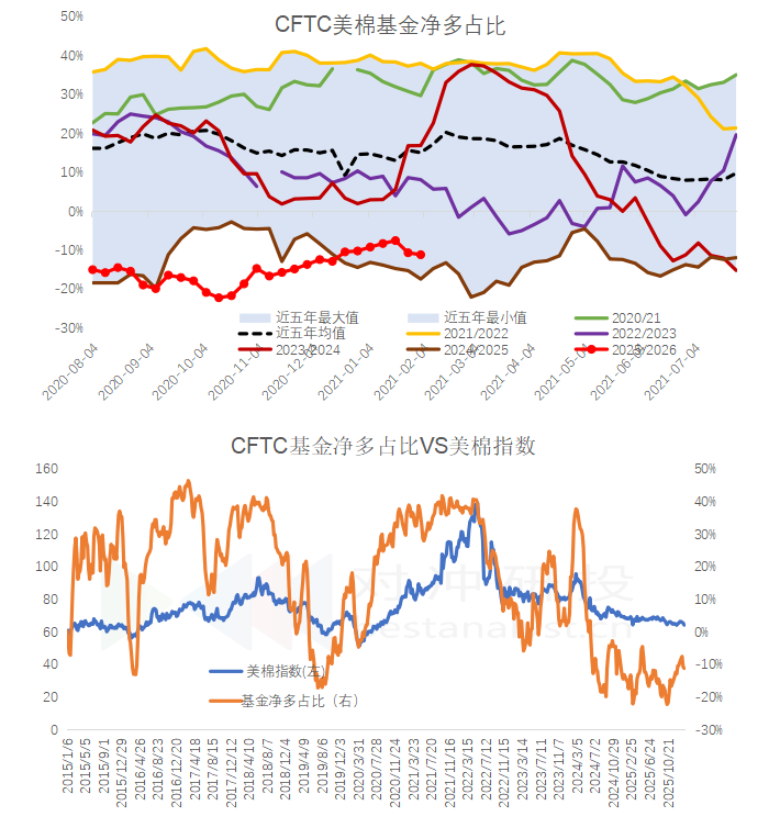 CFTC美棉基金:截止2月3日仅期货非商业基金净多占比减至-11.2%,同比增加6.3个百分点
