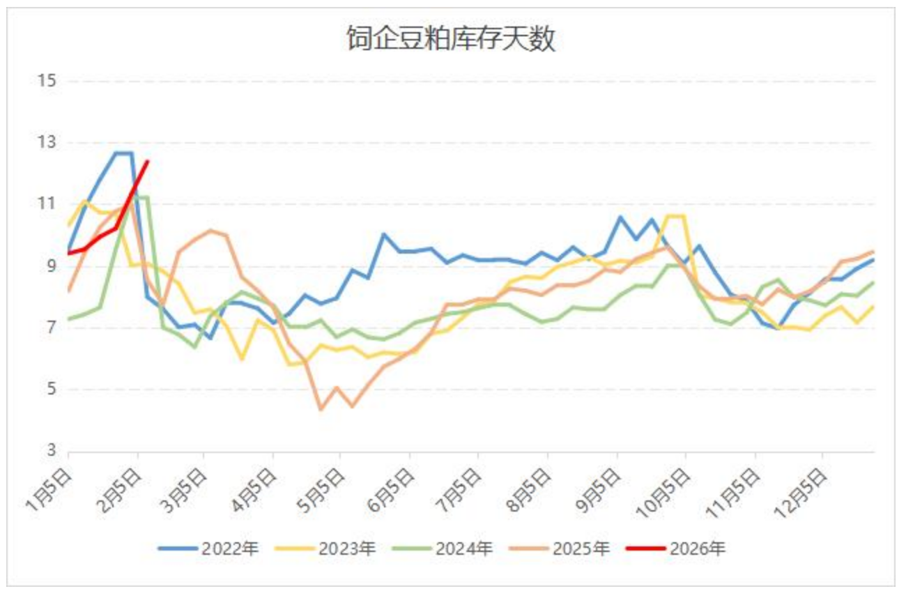 上周国内饲料企业物理库存各地普遍上升,全国增幅明显,其中鲁豫、广东及华北等市场增幅较大。具体分析,国内油厂开机表现依旧高位运行,油厂去库节奏提升不足,豆粕库存下调势头未能延续,供应仍显承压;下游需求表现不及预期,饲料企业库存及基差前期建仓较满,当前滚动补库维持;随着备货窗口期逐渐缩短,饲料企业年底节奏略有加速,库存天数小增调整为主。据Mysteel农产品对全国主要地区的50家饲料企业样本调查显示,截至2月6日(2026年第6周),全国饲料企业豆粕物理库存12.37天,较上一期增1.04天,较去年同期增3.83天。
