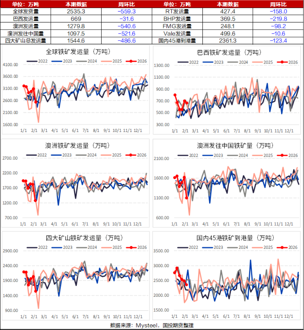 据Mysteel,2026年2月2日-2月8日,全球铁矿石发运总量2535.3万吨,环比减少559.3万吨。澳洲巴西铁矿发运总量1948.9万吨,环比减少572.1万吨。澳洲发运量1279.8万吨,环比减少540.6万吨,其中澳洲发往中国的量1097.5万吨,环比减少521.6万吨。巴西发运量669.0万吨,环比减少31.5万吨。