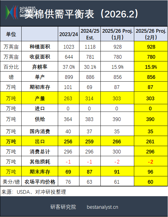 USDA美棉供需月报:2月预估2025/2026年度美棉产量环比持平