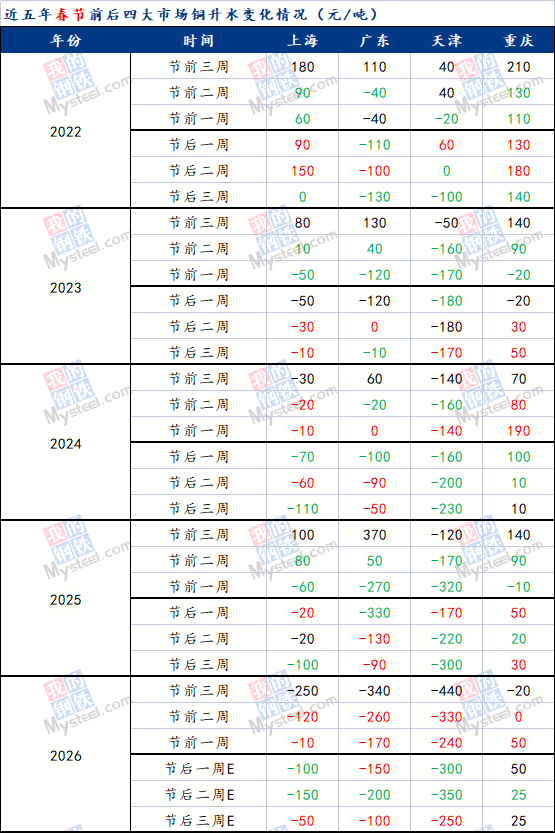 据Mysteel,2022-2026年春节前后国内主流市场电解铜现货升贴水变化情况,如图: