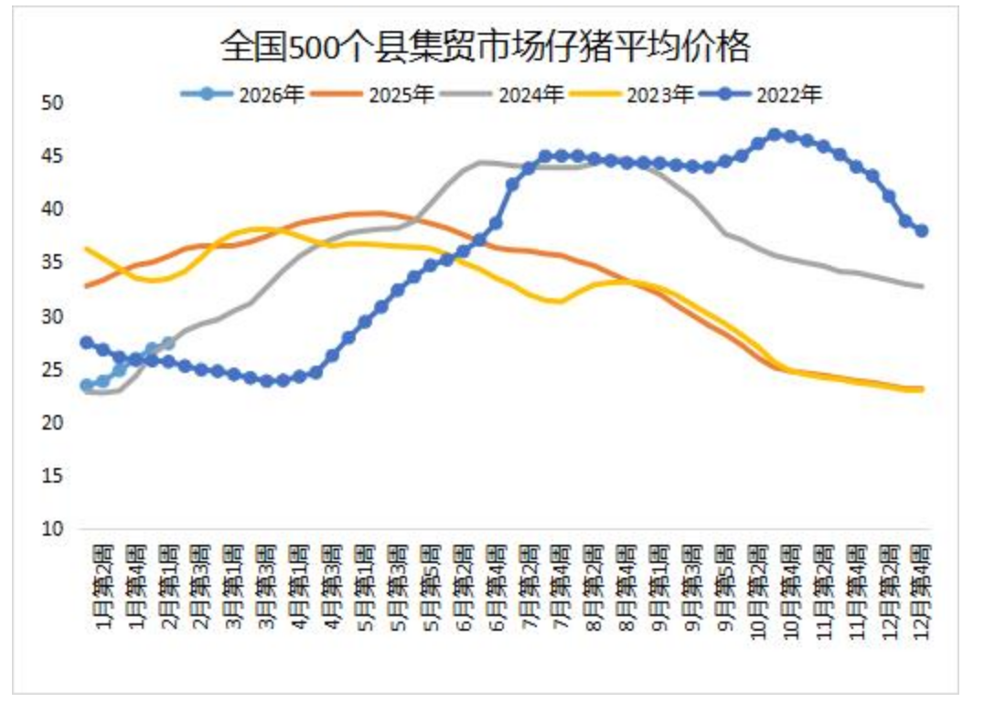 养殖端对远月猪价信心转强,集团厂有刚性补栏需求,中小散户前期集中出猪后也有补猪需求,仔猪价格继续大面积上涨。据对全国500个县集贸市场和采集点的监测,2月第1周全国仔猪平均价格27.39元/公斤,比前一周上涨1.9%,刷新4个月高点,同比下跌23.0%。宁夏、陕西、辽宁、上海、河南等25个省份仔猪价格上涨,海南、内蒙古、江苏仔猪价格下跌,天津价格持平。华南地区价格较高,为29.91元/公斤;华北地区价格较低,为25.68元/公斤。